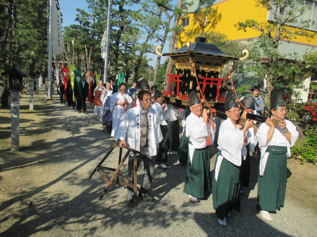 この神事は通称「お旅」と言って、社殿で祭典が終了すると、神霊が神輿に乗り移られて所定のお旅所まで出御され、下情を視察する意味が込められている。