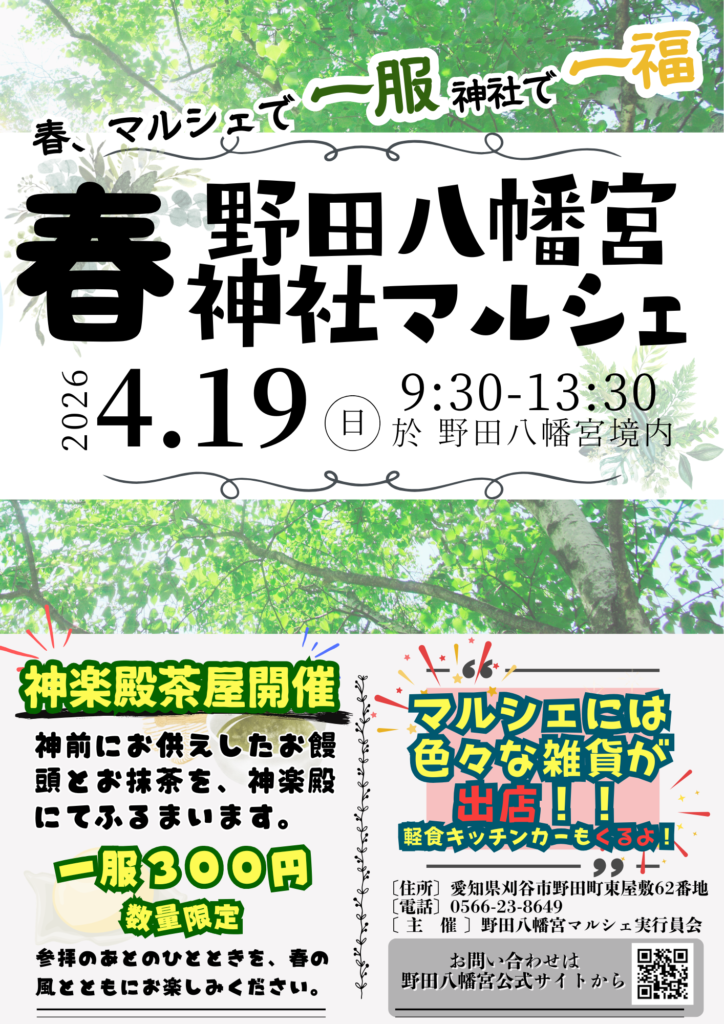 4月19日(日)は、野田八幡宮が賑やかなマルシェに大変身!✨ キラキラの新緑に包まれながら、お気に入りの雑貨や美味しいキッチンカーを巡りませんか?🛒🍕 神楽殿では、この日だけの特別な「お抹茶とお饅頭」も楽しめます(なんと300円!🍵)。